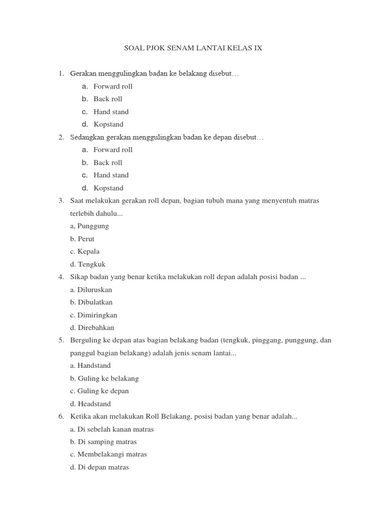 Berikut ini beberapa contoh soal pilihan ganda tentang senam lantai kelas 4 SD: